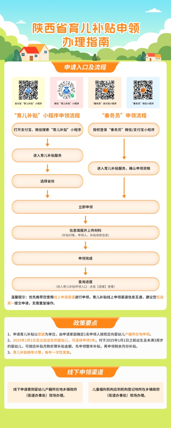 申領實行線上線下相結合方式,以線上申請為主,申領人可通過支付寶、微信平臺“育兒補貼”小程序進入育兒補貼申領專區進行申請。