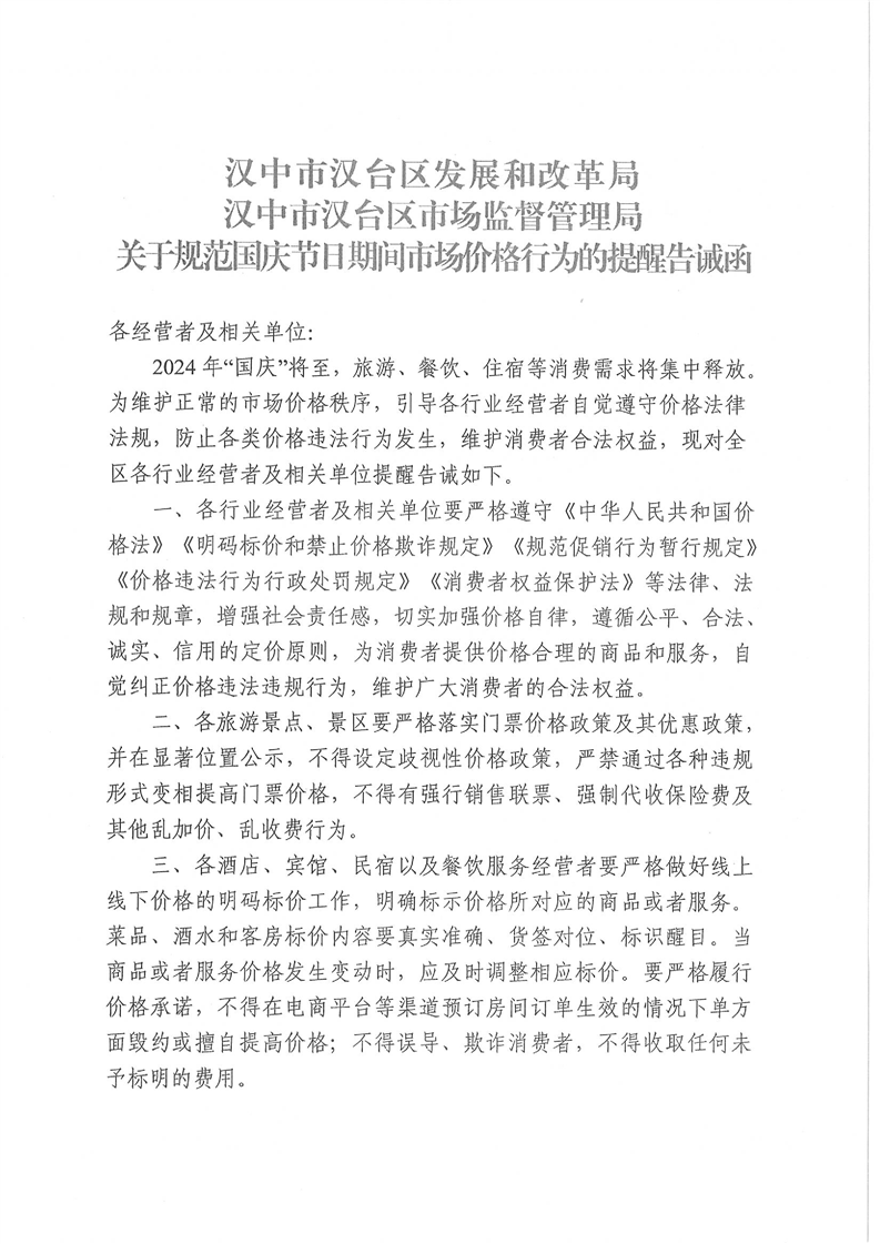關于規范國慶節日期間市場價格行為的提醒告誡函