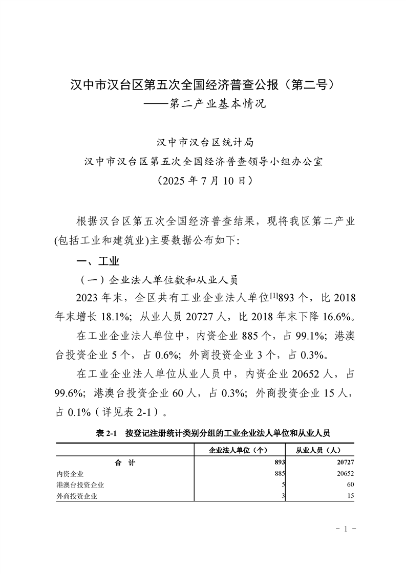 漢中市漢臺區第五次全國經濟普查公報(第二號)——第二產業基本情況