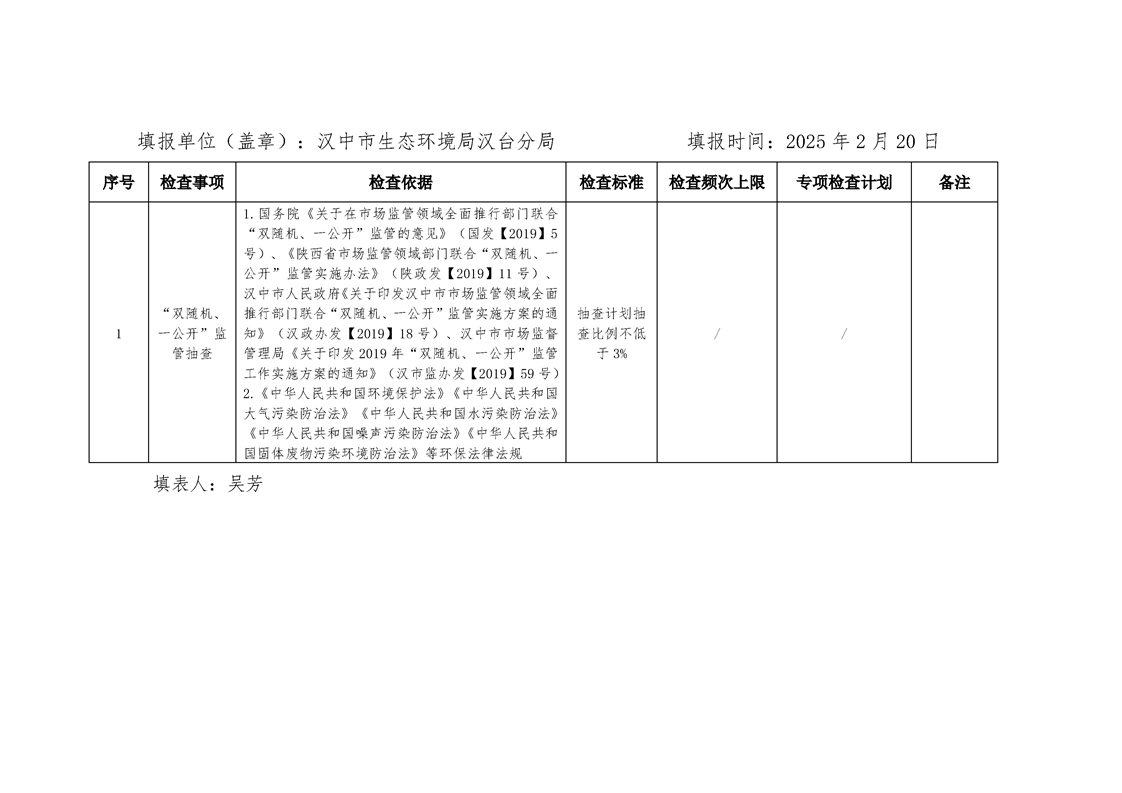 漢中市生態環境局漢臺分局涉企行政檢查事項梳理表
