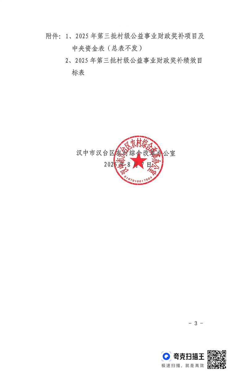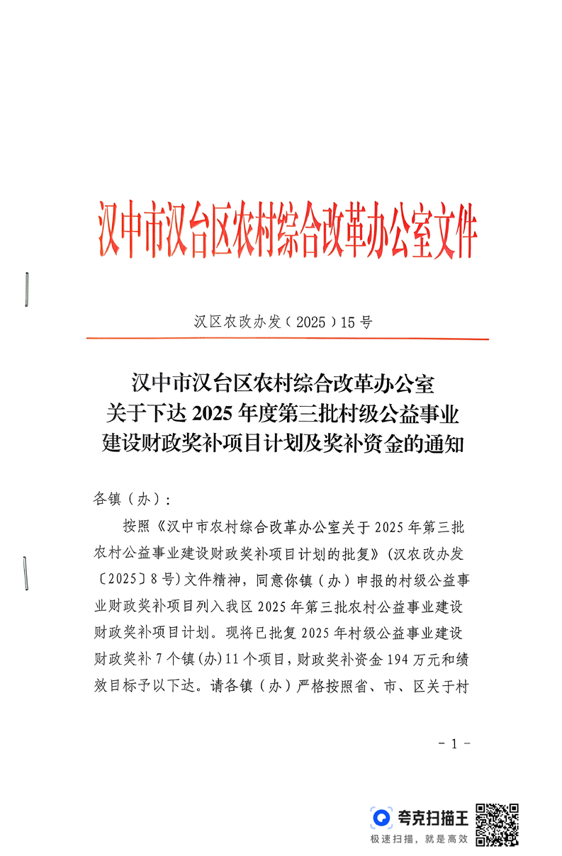 關于下達2025第三批村級公益事業建設財政獎補項目計劃及獎補資金的通知