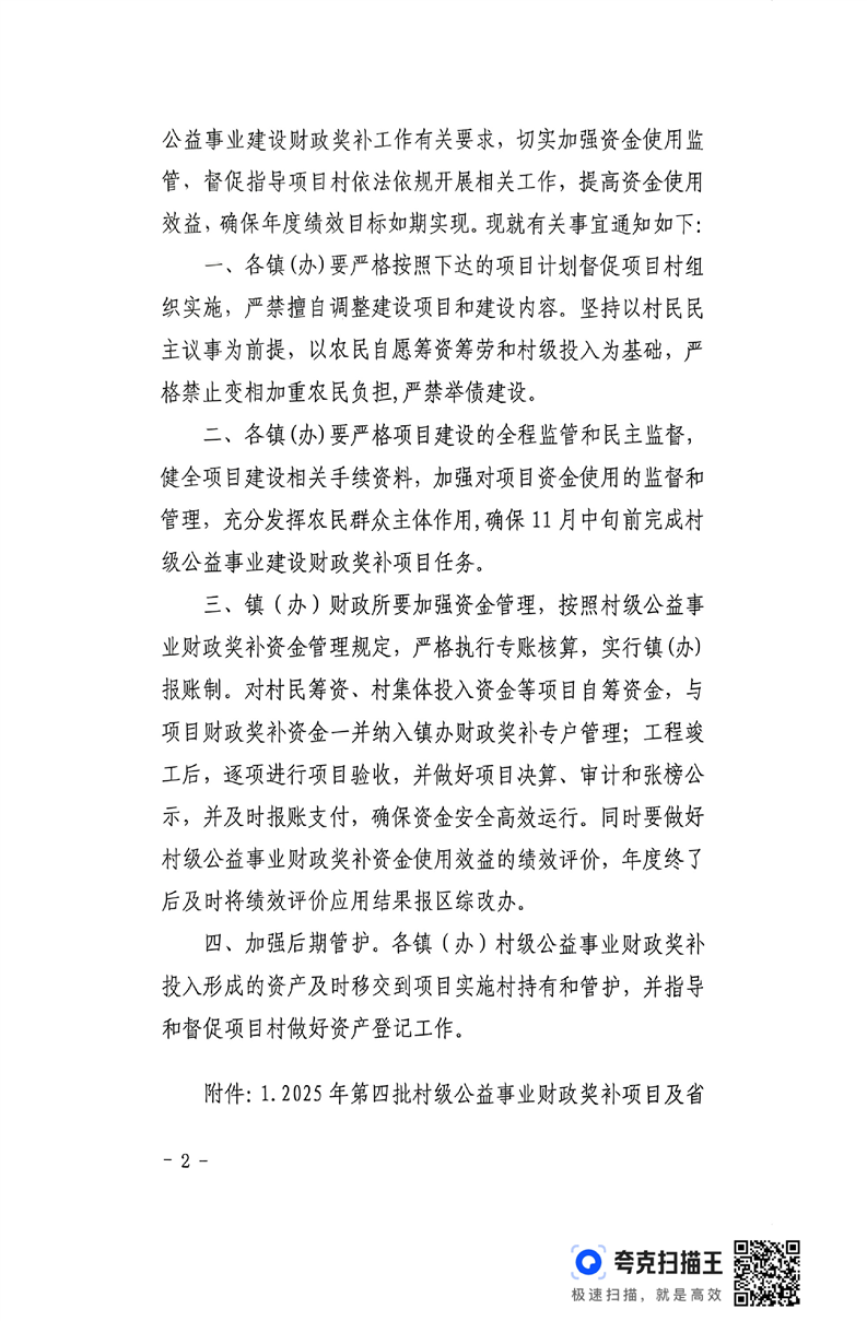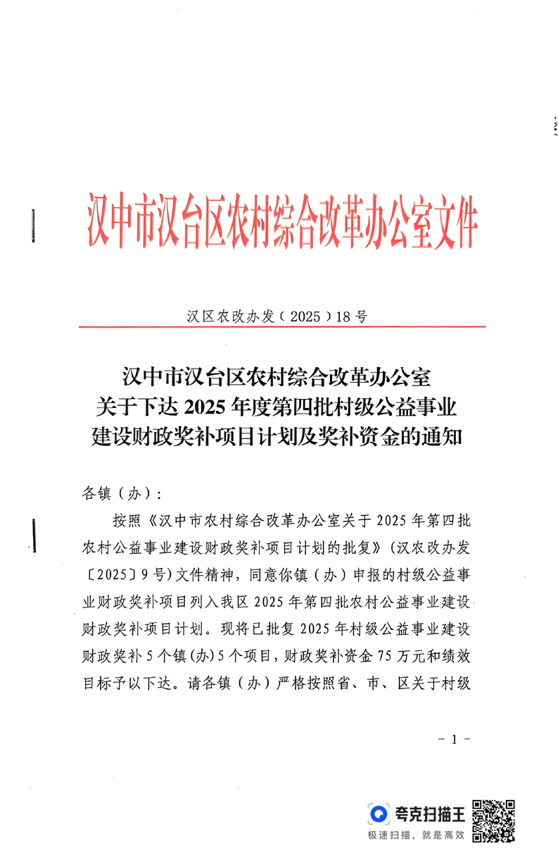 關(guān)于下達(dá)2025第四批村級(jí)公益事業(yè)建設(shè)財(cái)政獎(jiǎng)補(bǔ)項(xiàng)目計(jì)劃及獎(jiǎng)補(bǔ)資金的通知