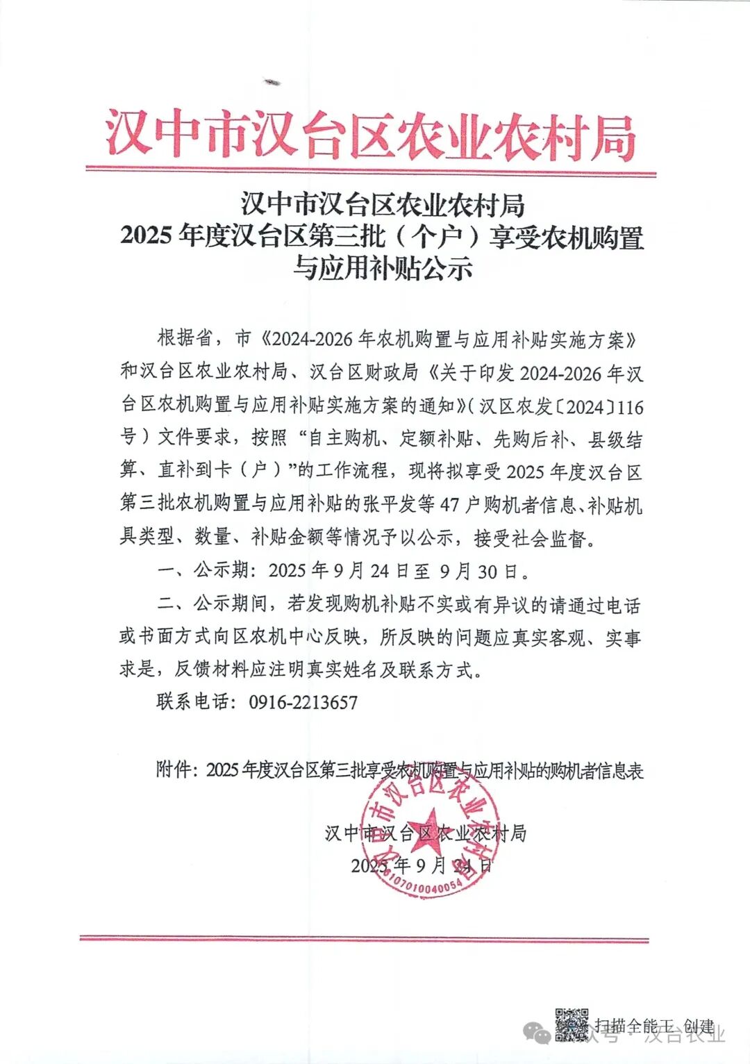 漢中市漢臺區農業農村局2025 年度漢臺區第三批(個戶)享受農機購置與應用補貼公示