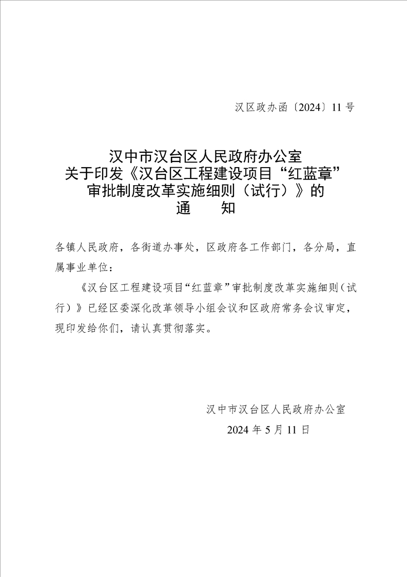 漢中市漢臺區人民政府辦公室關于印發《漢臺區工程建設項目“紅藍章”審批制度改革實施細則(試行)》的通 知