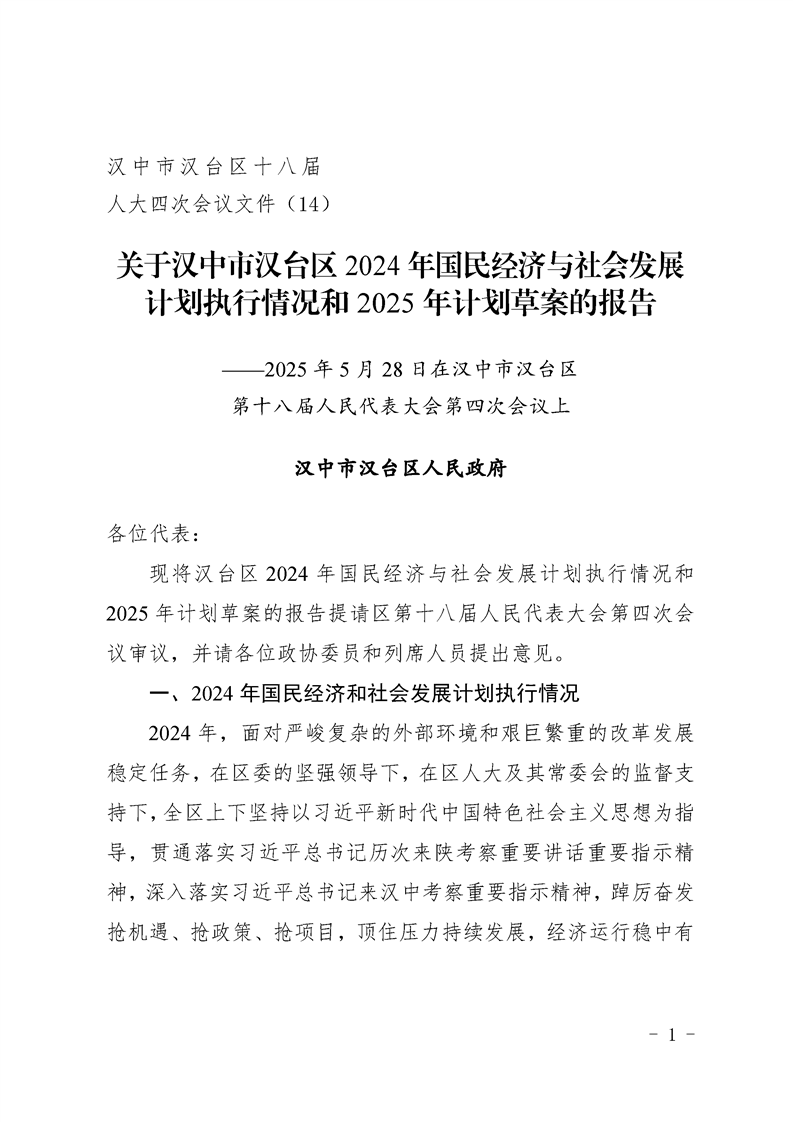 關于漢中市漢臺區2024年國民經濟與社會發展計劃執行情況和2025年計劃草案的報告