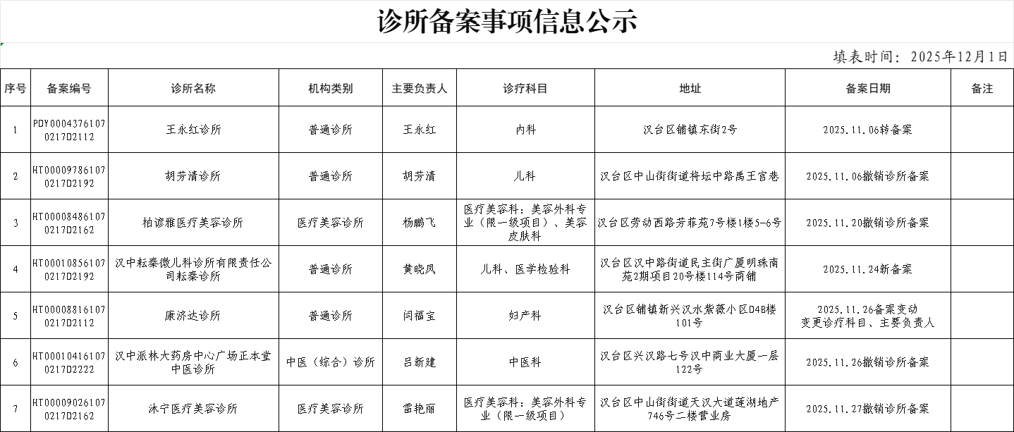 按照《國家衛生健康委和國家中醫藥局印發關于診所備案管理暫行辦法的通知》(國衛醫政發〔2022〕33號)及《漢中市漢臺區人民政府辦公室關于建立行政審批與監管協調聯動工作機制的通知》(漢區政辦函〔2018〕84號)要求,現向社會公開區級權限診所備案信息(附件),如有問題,請向區衛生健康局或區行政審批服務局反映。